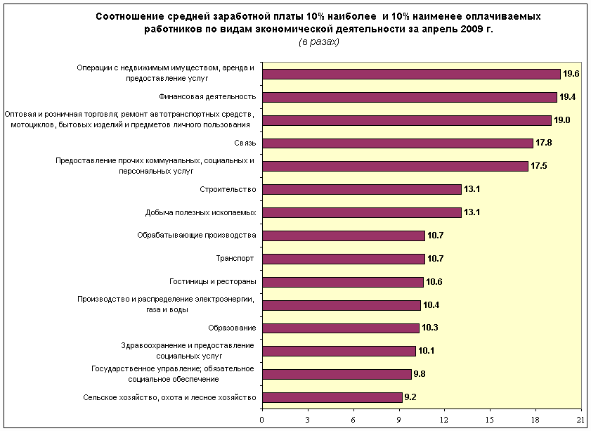 Соотношение средней заработной платы 10% работников с наибольшей и 10% работников с наименьшей заработной платой составило 14.7 раза (в апреле 2008г. - 20,6 раза). Уменьшение разрыва между средней заработной платой 10% наиболее оплачиваемых и 10% наименее оплачиваемых работников явилось следствием более высоких темпов прироста средней заработной платы группы наименее оплачиваемых работников (на 45%) по сравнению с группой высокооплачиваемых работников (на 3,5%). За период с апреля 2008г. по апрель 2009г. размер минимальной заработной платы увеличился в 1,9 раза, что существенно повлияло на рост заработной платы группы наименее оплачиваемых работников. Наибольший разрыв в оплате крайних 10%-ных групп работников наблюдался в организациях, занятых в сфере операций с недвижимым имуществом, аренды и предоставления услуг; финансовой деятельности; оптовой и розничной торговли, ремонта автотранспортных средств, мотоциклов, бытовых изделий и предметов личного пользования.