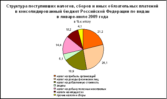 Основную часть налогов, сборов и иных обязательных платежей консолидированного бюджета в январе-июле 2009г. обеспечили поступления налога на доходы физических лиц - 26,1%, налога на прибыль организаций - 21,2%, налога на добавленную стоимость на товары (работы, услуги), реализуемые на территории Российской Федерации, - 18,9%, налога на добычу полезных ископаемых - 14,4%.