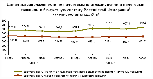 По оперативным данным Федеральной налоговой службы, задолженность по налогам и сборам, учитываемая с момента ее возникновения (без учета задолженности по единому социальному налогу, зачисляемому в федеральный бюджет, и уплате пеней и налоговых санкций), в консолидированный бюджет Российской Федерации на 1 августа 2009г. составила 640,6 млрд.рублей. По сравнению с 1 января 2009г. она увеличилась на 14,6%, в том числе по налогу на добавленную стоимость - на 17,5%, налогу на прибыль организаций - на 6,7%, по акцизам в целом - на 3,4%. Уменьшилась задолженность по налогу на добычу полезных ископаемых - на 11,3%.