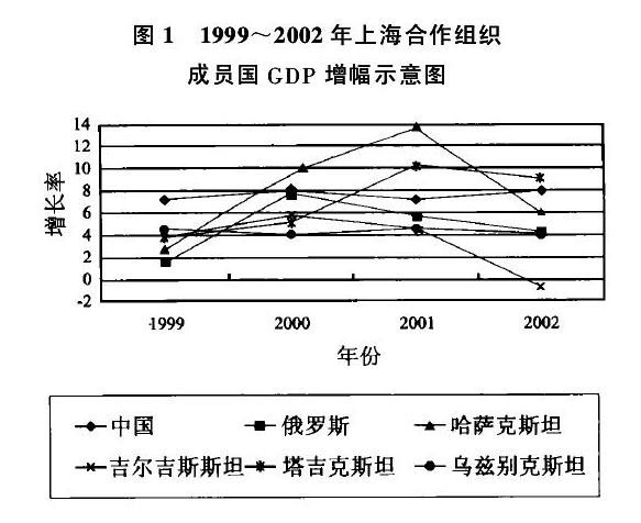 1999年以来,俄、哈、吉、塔、乌五国逐步走出了1998年俄罗斯金融危机的阴影,同期国际市场能源商品价格攀升又进一步推动了经济发展,各国经济先后摆脱了连年下滑的局面,呈现出快速增长势头。中国在1997年亚洲金融危机之后,逐步采取扩大出口和扩大内需的政策,GDP一直保持了每年7%~8%的增幅。在世界经济普遍低迷的形势下,上海合作组织各成员国在1999~2002年实现了GDP较快的增长,成为世界各区域经济组织中的一个亮点。