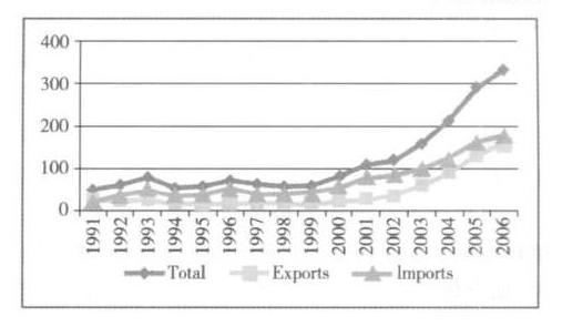 1991~2006年中俄贸易的发展轨迹如图1所示,从中可以清晰地看出,其发展以2000年为分水岭,被划分为两个阶段。