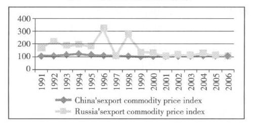 1991~2006年中国实际国民收入变化比较平稳,而俄罗斯国民收入波动较大。两国国民收入从2000年开始均出现了持续上涨的势头。中 国出口商品价格指数的变化非常平稳,而俄罗斯的价格指数在1993~1999年出现了不正常的上升,而后逐渐趋于正常[3]。