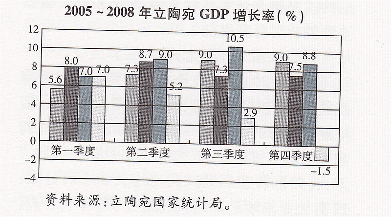 据初步核算,2008年立陶宛国内生产总值为1 114.305亿立特(约合472.78亿美元),同比增长3.2%,增幅比2007年下降5.7个百分点;人均GDP为3.3167万立特(约合1.奶72万美元),较2007年增长3。7%。其中,第一季度GDP增长7%,第二季度增长5.2%,第三季度增长2.9%,第四季度增长—1.5%。也就是说,立陶宛经济在第四季度出现了自2001年以来的首次负增长(见下图)。
