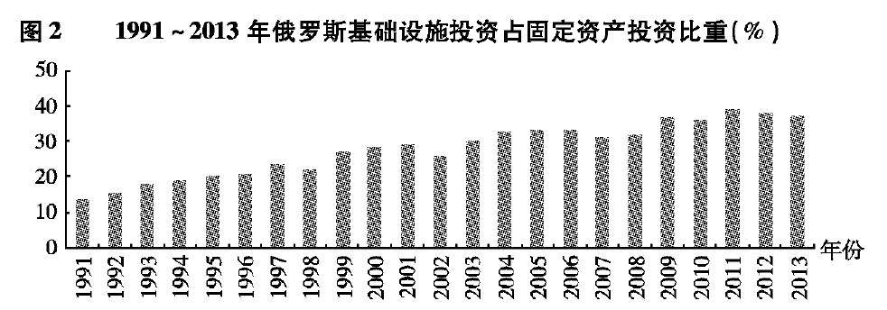 图2 1991~2013年俄罗斯基础设施投资占固定资产投资比重(%)