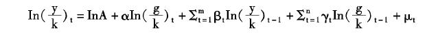 为滞后变量前的参数,称为长期或均衡的弹性,表示滞后变量变动一个百分比,被解释变量变动的百分比。模型中滞后期长度为m、n,关于模型滞后期的长度,在回归模型中根据滞后期前参数的显著性水平加以判断[11]。