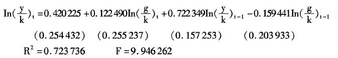 采用逐步回归的方法,逐期将滞后变量引入模型,通过运用普通最小二乘法回归后判断滞后变量前参数的t统计量与临界值的比较,决定引入滞后变量的期数。经过分析,得出应当在计量模型中引入一期滞后被解释变量和一期滞后解释变量,具体回归的结果如下。