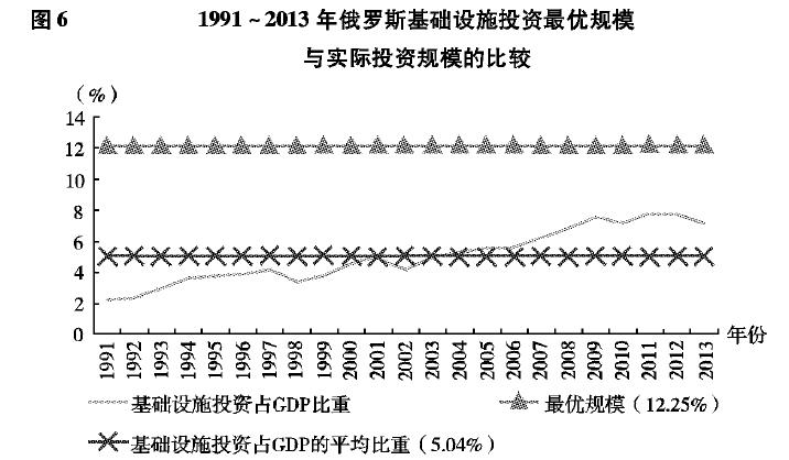 图6清晰地显示了1991~2013年俄罗斯基础设施投资的实际规模与其最优投资规模的差距。其中,横轴代表年份,纵轴代表基础设施投资占GDP的比重,线表示俄罗斯基础设施投资的最优规模,线表示基础设施投资占GDP的平均比重。由图示可以看出,虽然俄罗斯基础设施投资占GDP的比重大体呈现逐年增长的趋势,但是其平均值仍然没有达到基础设施投资最优规模的一半。这说明,仅基础设施投资这一项还有很大的增长空间,扩大其投资规模以拉动投资对经济增长的贡献的潜力仍然很大。