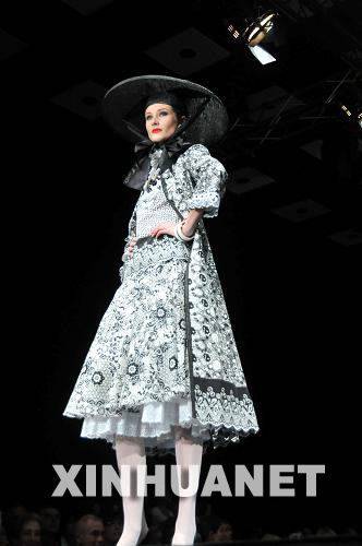 10月17日,在莫斯科举行的俄罗斯2010年春夏时装周上,一名模特展示俄罗斯著名服装设计师扎伊采夫的作品。当日,俄罗斯2010年春夏时装周在莫斯科世界贸易中心盛装开幕。新华社记者高帆摄