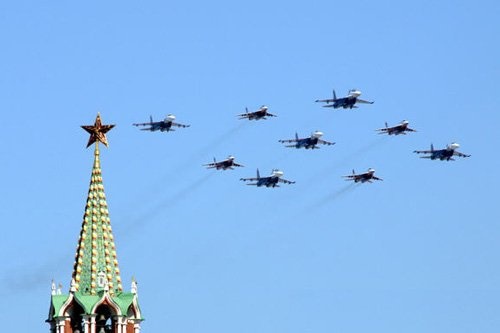 “看,飞机!”一名不认识的俄罗斯男子轻拍了一下我的肩头。斜上方,一个直升机群低飞过克里姆林宫上空。此时,受阅的武装车辆经过红场后,也来到我们面前,履带发出的隆隆声难掩人们的欢呼声。