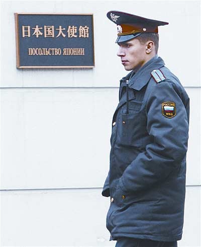 一名俄罗斯内政部官员在日本驻俄使馆门前。