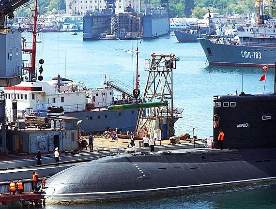 俄海军黑海舰队军港中“基洛”级潜艇在补充鱼雷[资料图片]