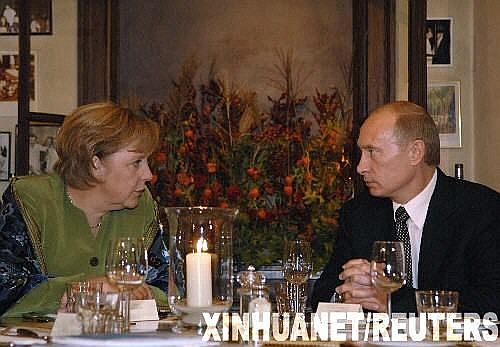 10月14日,德国总理默克尔(左)在德国西南部的威斯巴登附近一家餐厅与到访的俄罗斯总统普京一起用餐。之后,两人就国际热点问题举行了会谈。由于莫斯科降雪,普京总统的专机推迟了2个小时抵达德国。新华社/路透