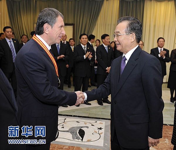 11月24日,正在俄罗斯进行正式访问的中国国务院总理温家宝在莫斯科向俄方人士颁发“中俄能源合作突出贡献奖”和“中国语言文化贡献奖”,感谢他们在上述领域作出的卓越贡献。这是温家宝向俄罗斯副总理谢钦颁发“中俄能源合作突出贡献奖”。新华社记者 谢环驰 摄