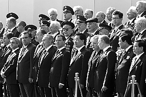 | 5月9日,俄罗斯纪念卫国战争胜利65周年庆典举行。胡锦涛同其他国家领导人在检阅台上观礼。新华社记者 樊如钧 摄 |