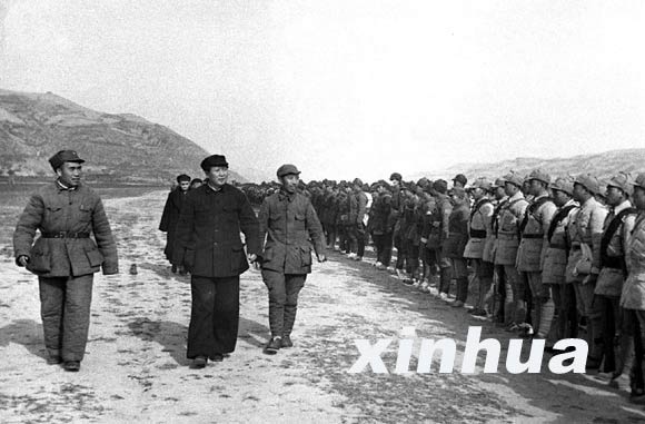 1944年11月9日,八路军第120师359旅4000余人,奉命组成南下支队,挺进豫、鄂、粤敌后,开辟新的抗日根据地。图为毛泽东和朱德由王震陪同,在延安机场检阅即将南下的部队。 新华社发