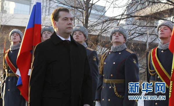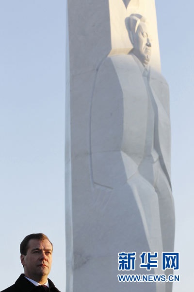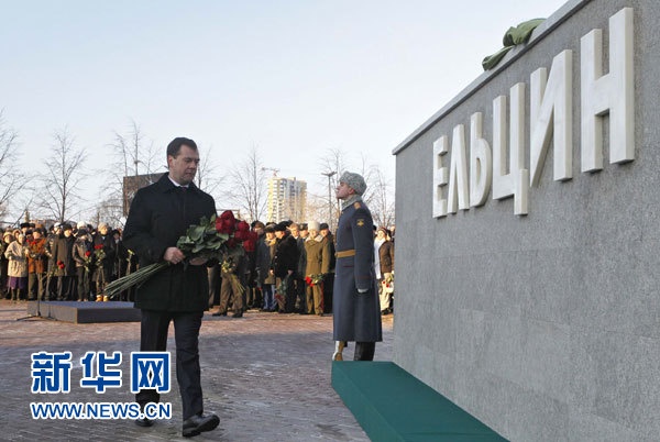 2月1日,俄罗斯总统梅德韦杰夫在叶卡捷琳堡俄罗斯首任总统叶利钦纪念碑前献花。新华社/路透