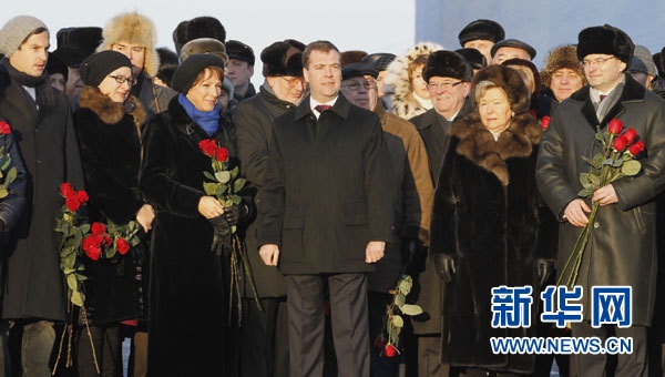 2月1日,俄罗斯总统梅德韦杰夫(前中)在叶卡捷琳堡参加俄罗斯首任总统叶利钦纪念碑揭幕仪式。新华社/法新