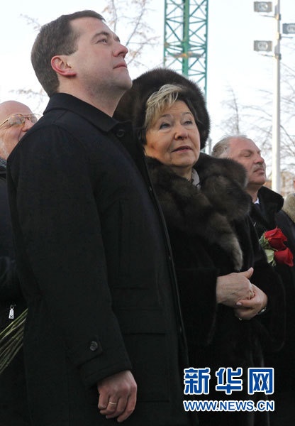 2月1日,俄罗斯总统梅德韦杰夫(前)在叶卡捷琳堡参加俄罗斯首任总统叶利钦纪念碑揭幕仪式。新华社/法新