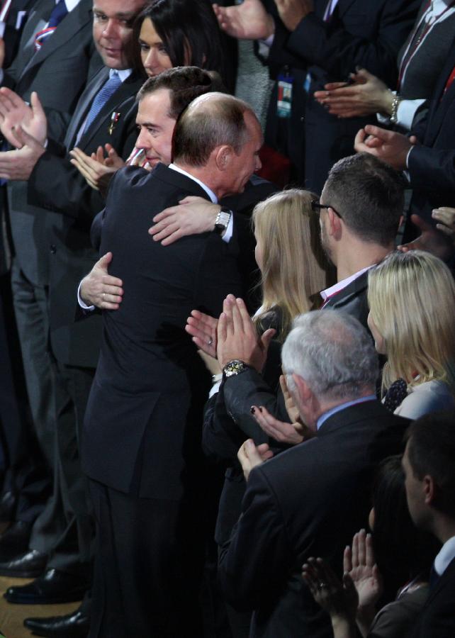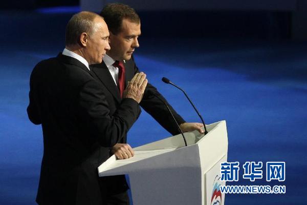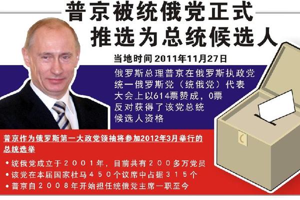 11月27日,在俄罗斯首都莫斯科,俄罗斯总统梅德韦杰夫(右)与总理普京在俄罗斯执政党统一俄罗斯党的代表会议上共同在台上发言。新华社发(卡瓦廖夫摄) 警告西方勿干涉俄选举 【路透社莫斯科11月27日电】弗拉基米尔·普京今天接受了俄罗斯执政党统一俄罗斯党的提名,将作为该党候选人参加明年3月4日举行的总统选举,为其任总理4年后重掌国家最高权力铺平了道路。 选择现在宣布这一消息似乎是为了给将于12月4日参加国家杜马(议会下院)选举的统俄党提振士气。该党目前的支持率有所下降。 普京甚至在统俄党会议进行最后一轮投票表决前就接受了提名。德米特里·梅德韦杰夫总统也参加了上述会议。普京和梅德韦杰夫9月24日在统俄党大会上宣布计划将于明年互换位置。 俄罗斯人对这一计划反应不一。有人担心这一世界头号能源大国会因此出现日益严重的停滞,也有人抱怨俄罗斯的政治前途受到幕后操控。 据民意调查结果显示,2000年至2008年出任总统的普京尽管目前支持率下跌,但仍可赢得总统选举。 【法新社莫斯科11月27日电】普京今天警告其他国家不要干涉该国12月的国家杜马选举和他有望获胜的2012年总统大选。 普京在执政党统俄党召开的大会上说,一些国家正付钱给俄罗斯的非政府组织,“试图干预我们国家的选举进程”。他称西方国家图谋影 响俄罗斯选举过程的举动“丝毫不会起作用,只是浪费金钱而已”。 普京说:“它们最好用这些钱偿还自己的国债,而不是用在徒劳无功、代价高昂的外交政策上。” 普京说:“我们所有的外国伙伴必须认识到这一点——俄罗斯是一个民主国家和可靠的伙伴,能够且应该能与其他国家和睦相处。” 他在一阵热烈的掌声中说:“但它永远不会听任外来势力的支配。” 【俄新社莫斯科11月27日电】统俄党总委员会主席团秘书谢尔盖·涅韦罗夫告诉记者: “推举我们的领袖普京为总统候选人的代表大会将在27日举行。因此,我们将成为第一-个提出总统候选人的政党。” 俄共和俄自民党也已表示将推举自己的总统候选人。俄共中央委员会第一副主席梅利尼科夫表示,将在12月17日的俄共代表大会上推出候选人久加诺夫。俄自民党打算在12月 13日党代会上提名党领袖日里诺夫斯基参选。 11月27日,在俄罗斯首都莫斯科,俄罗斯总理普京在俄罗斯执政党统一俄罗斯党的代表会议上发言结束后走回座位。当日,俄罗斯执政党统一俄罗斯党(统俄党)正式推选该党领袖普京参加明年3月的总统大选。俄罗斯总统梅德韦杰夫9月24日在统俄党代表大会上提议由现任总理普京参加总统选举。新华社发(卡瓦廖夫摄) 俄杜马选举硝烟味渐浓 【俄罗斯《莫斯科时报》网站11月25日报道】俄总理普京周四警告说,统俄党在选举中落败将让俄罗斯落入“像我们欧洲朋友一样的”经济危机。 普京周四与统俄党高层官员会见,敦促他们在12月4日的选举中“争取最佳结果”。他说,如果一个政党无法控制杜马,“我们将不能及时做出必要的决定……从而面临我们欧洲朋友和伙伴所面临的困境”。 普京把希腊、葡萄牙、意大利和法国作为反面例子,称赞俄政府“没有将该国拖入债务深渊”。他说,这多亏了统一俄罗斯党。 【香港星岛环球网11月27日报道】俄总统选举之前,国家杜马12月4日将迎来选举。这一选举被认为是总统选举的“预演”,统俄党预计将保住多数席位。但是官方的舆论研究中心最新民调结果显示,统俄党今年将“失分”,可能保不住三分之二的绝大多数。最近的全国民调显示,只有53%的人打算投给普京所在的统俄党,而4年前的数据是64%。 对此,梅德韦杰夫说,稳定的大多数就够了,统俄党失去部分席位正意味着俄罗斯的民主。不过,统俄党一真在尝试用新的方法吸引俄罗斯民众,例如开始吸纳地区候选人,并表示愿意与反对党候选人辩论。 国外媒体目前一方面报道了普京正式参选总统的消息,但同时也对普京所在的统俄党在国会选举中可能丧失绝大多数表示关注。 自从普京宣布参选后,俄国内对普京 “个人崇拜”的呼声似乎越来越高,俄 10月份进行的民调显示,25%的受访者认为国内存在对普京的个人崇拜。而在 2004年普京担任总统时,只有10%的人认为存在个人崇拜现象。 【德新社莫斯科11月27日电】在俄议会选举前夕,人权活动人士和反对派指控普京的统俄党耍弄卑鄙手段。 该党领导人显然担心选举表现,因为民调显示统俄党的支持率下滑。在12月4日议会选举前,有越来越多关于违反选举法的报道。违规行为包括向依靠补助金生活的人施压、在学校搞宣传活动、给政府支持者送礼。人权活动人士批评说,这种做法不公平、不合法。 最近受到影响的是一幅讽刺漫画,普京被画成一个疯狂的老头,选举委员会立即禁止该漫画的传播。 独立的选举监督机构戈洛斯协会发言人说:“数周来,我们不断接到愤怒抗议者的电话。”这位发言人表示,致电者说,军队±兵、养老院老人或工厂工人都被动员投票给统俄党。 网上业余人士拍摄的视频显示,统俄党官员对地方市长说,是否为当地修路取决于支持率高低。 戈洛斯协会发言人还说,西伯利亚医院的患者被威胁说,如果他们投票“不正确”,将会被立刻停止治疗。 2011年11月27日 图表:普京被统俄党正式推选为总统候选人 新华社记者 周大庆 编制 统俄党杜马席位或减少 【美国《华尔