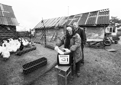 4日,俄罗斯斯摩棱斯克,一名选民在鸡场边投票。俄罗斯当天举行国家杜马大选。