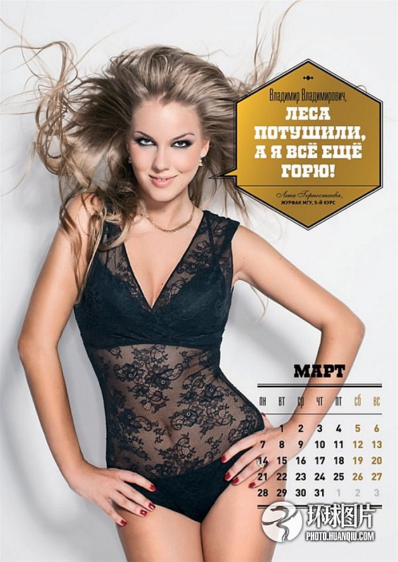 据悉,这12名女生来自莫斯科国立大学新闻专业。其中,身穿黑色蕾丝内衣的“3月模特”丽娜想对普京说:“虽然你扑灭了森林大火,但我心中的火焰仍在熊熊燃烧。”