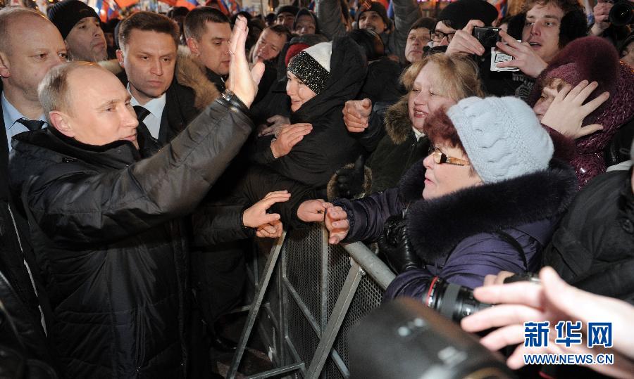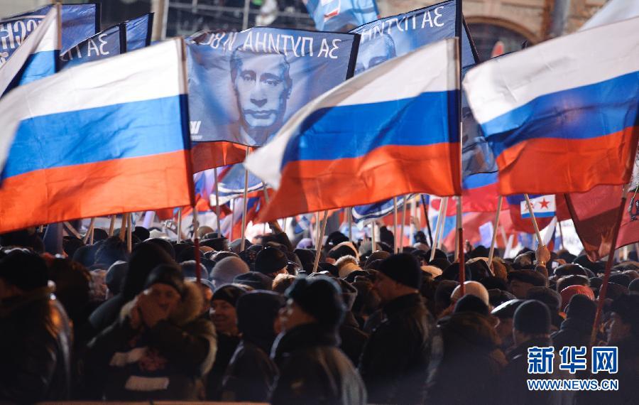 3月4日,在俄罗斯首都莫斯科马涅什广场,普京支持者庆祝普京胜出。当晚,俄罗斯首都莫斯科马涅什广场、特维尔大街等地区聚集了超过11万名普京支持者。许多人高举俄罗斯国旗或绘有普京头像的旗帜,庆祝普京胜出。俄罗斯第六届总统选举投票在莫斯科时间4日21时(北京时间5日1时)结束。俄罗斯最大的民意调查机构之一——全俄舆论研究中心公布的出口民调结果显示,普京获得58.3%的选票,赢得选举胜利。新华社记者姜克红摄