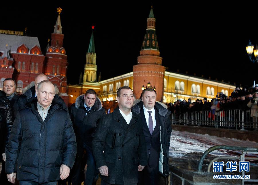 3月4日,俄罗斯总统梅德韦杰夫(前左二)和总统候选人、总理普京(前左一)出席在莫斯科马涅什广场举行的集会活动。 新华社/俄新社