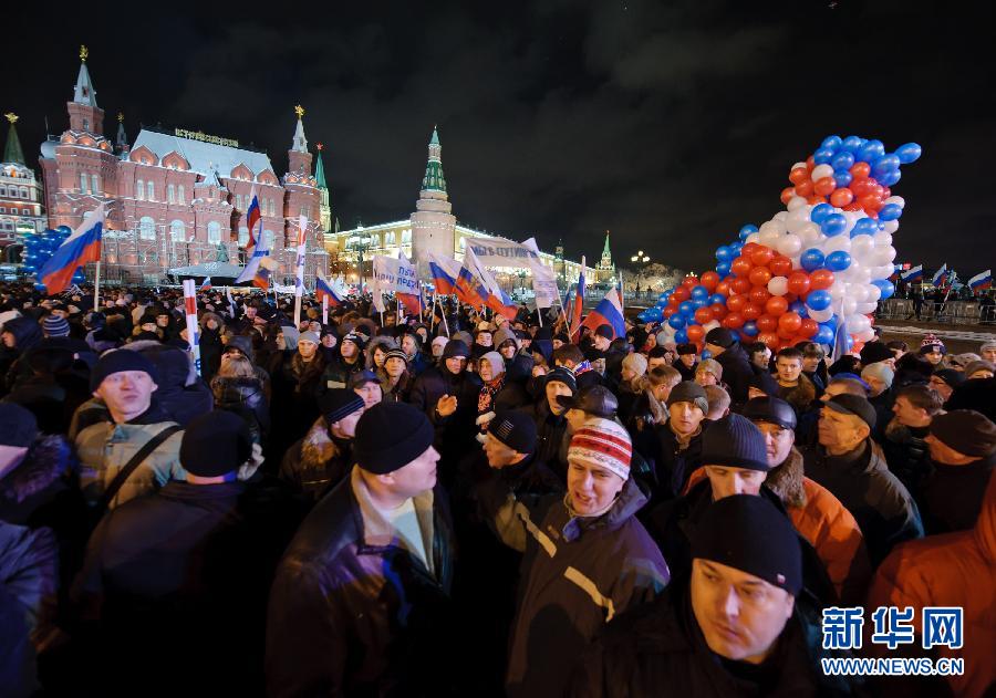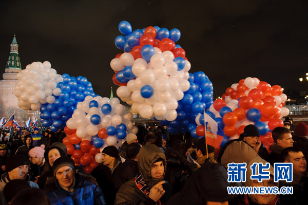 3月4日,在俄罗斯首都莫斯科马涅什广场,普京支持者庆祝普京胜出。新华社记者姜克红摄