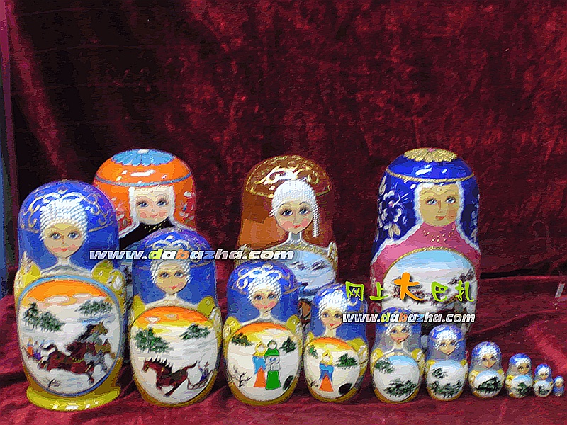 在俄罗斯的许多城市,不管你走到哪个市场、商店或者旅游景点的摊位上,几乎都可以看到一种彩色的木制玩具娃娃,而且特别受旅游者的欢迎。这种木头娃娃一般都是身穿民族服装的俄罗斯姑娘,头上戴着鲜艳的花头巾,金色头发,俏皮的大眼睛嵌在红扑扑的脸蛋上,造型纯朴,色彩艳丽,具有浓郁的俄罗斯民族色彩。木头娃娃的腰部可以打开,里面套着一个稍小的娃娃,再打开,又套一个,一般为连续套5至8个的,还有的能连续套十几个,其中最里面的那个娃娃,甚至小到如黄豆般大小,可是依然须眉毕现、栩栩如生。这种娃娃,中国人称之为“套娃”,就是娃娃套娃娃,俄语称为“玛特廖什卡”。