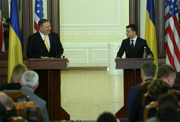 2020年1月31日,在乌克兰基辅,乌克兰总统泽连斯基(右)与美国国务卿蓬佩奥出席联合新闻发布会。