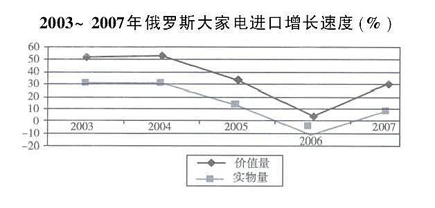 以俄罗斯大家电市场(即以洗衣机、电冰箱和空调等构成的相对于由电饭煲、电熨斗和电风扇等构成的小家电市场的家电市场)为例,如下图所示, 2003年和2004 年两年俄罗斯家电进口的价值量增长速度和实物量增长速度分别达到了50%和30%以上,家电进口处于快速增长阶段。但是进入2005年以后速度有所下降,突出表现在2006年,大家电的价值量增长速度在2006 年首次未超过4% ,而大家电的实物量增长速度甚至出现了负增长10%。但是,这种情况在2007 年得以缓解, 2007 年大家电市场进口的实物量增长速度和价值量增长速度分别达到了8. 6%和29. 9%[5]。此外,世界金融危机、消费市场通货膨胀速度的加快以及居民货币收入增长的减缓已经导致俄罗斯家电市场规模在2008年下半年出现下降。但是,尽管如此,俄罗斯家电市场仍然继续被视为在欧洲最具前景和快速发展的市场。根据探索咨询集团的统计,俄罗斯家电市场的规模在2008年达到80亿美元(与2007年相比负增长10% ) ,而在2009 年继续出现负增长20% ,达70亿美元。接下来市场将开始恢复并且在2010年将增长15%。在2011~2012年增长速度将相应为12%和10%[6]。从长期看,俄罗斯家电市场的需求旺盛,潜力巨大,未来将可保持稳定增长的态势。