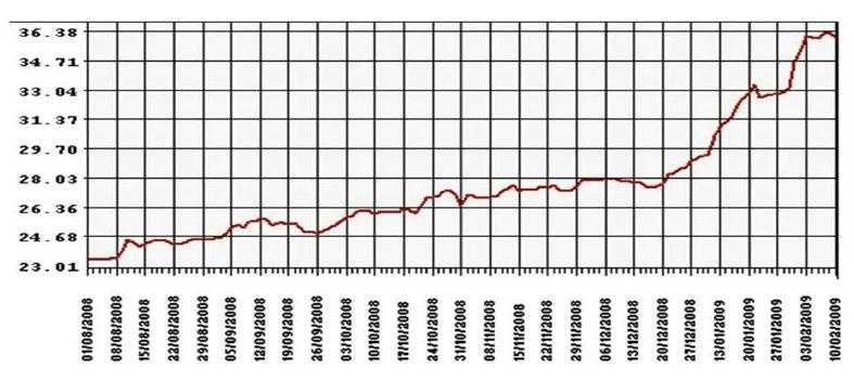图5 2008年8月1日~2009年2月10日卢布与美元的汇率走势图
