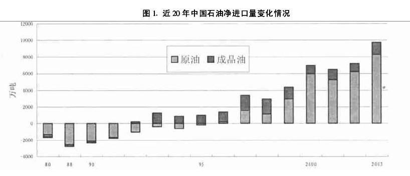 近些年来,随着我国经济持续发展,对能源的需求越来越大,我国石油产量和石油探明储量已不能保证国民经济持续发展的需要,石油供需之间的缺口不断加大,进口持续增加(见图1)。对于我国未来石油需求及进口发展趋势,国内外的不同部门都进行了预测。中国国家信息中心2003年的预测结果认为,2010年、2020年我国的原油缺口将分别达到1.2~1.3亿吨、2.1~2.3亿吨,这部分缺口只能由进口原油来补充,届时,进口原油的比例将超过40%和50%,进口原油将逐步成为我国原油供应的主体;美国能源情报署发布的《2001年国际能源展望》的预测结果也相差不多,2010年和2020年中国石油需求量将分别达到2.9亿吨和3.9亿吨左右,而同期国内原油产量约为1.7亿吨和1·8亿吨,相应的石油供需缺口为1.2亿吨和2.1亿吨左右。