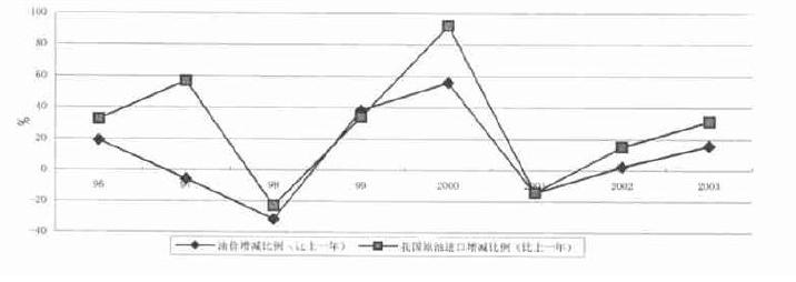 由于石油市场竞争日益激烈、主要产油国或地区发生战争动乱等突发事件、主要石油生产国(如欧佩克)单方面的减产或增产、国际石油期货市场发展引发期货投机等等因素使国际石油价格复杂多变,极不稳定。而我国又缺乏有效的避险手段,基本是被动接受国际油价的变化,国民经济的正常运行受到一定的冲击。不仅如此,我国的石油进口量与国际油价走势在一定程度上表现为正相关,即油价高时,进口量增加,油价低时,进口量减少。具体见图2。1998年由于金融危机,油价下跌幅度超过30%,而我国原油进口也下降23%,2000年国际油价比1999年上涨了56%,我国原油进口量比1999年增长了92%,达到破记录7 026.53万吨,为此我国多支付72.3亿美元,占当年GDP的0.671%。2003年油价上涨15.8%,我国原油进口也上涨了31.3%。这种情况直接导致我国财富的净流失。因此,我国不仅要重视保证石油的稳定安全供应,还必须强调要以合理的代价在国际市场上买到石油,这既需要我们研究市场,掌握国际市场的竞争规律、价格变动规律,并积极参与石油期货市场,另一方面也需要通过在石油资源国合作勘探开发,取得“股权油”来规避一定的市场风险,并加强与其他石油需求国家的协调以避免破坏性和无序竞争造成的严重后果,以此保证能源市场的稳定和避免不可预见情况的发生。
