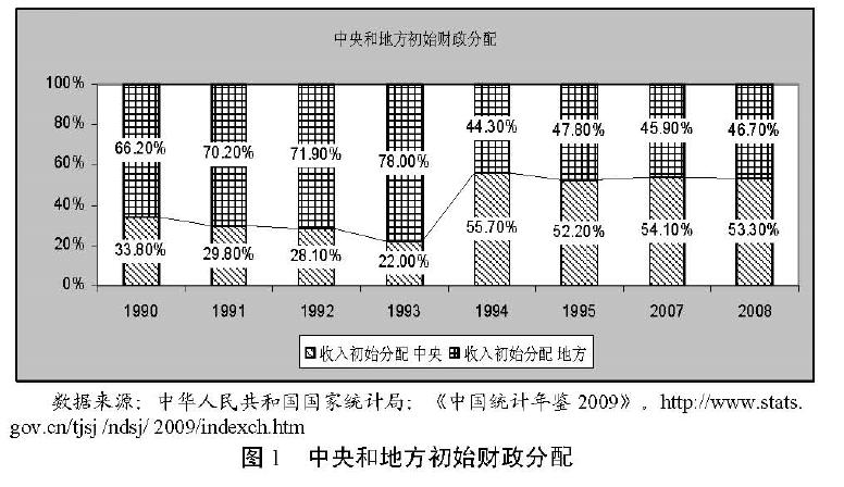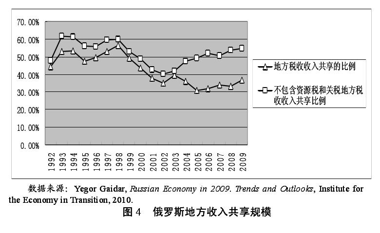 与中国相同,俄罗斯在 1994 年以来也对税收体制进行了改革,实行分税制,对联邦政府和地方政府在税收权限上进行进一步的划分。如表 1 所示,地方分享较大的收入是个人所得税和消费税,而税基宽的增值税主要集中在联邦。但与中国不同的是,虽然俄罗斯税收立法权集中在中央,但地方政府拥有一定的税收自主权,其中联邦主体的执法机关和代表机关有权规定纳入地方财政的那部分税收的税率,有权新增税种。地方政府在财政和税收领域所具有的独立性,使俄罗斯的财政收入分配向着有利于地方财政的方向发展。如图 4 所示,俄罗斯地方财政税收收入占国家财政总税收收入的比重从1995 年的 47.6%上升到 1998 年的 56.6%。但 1999 年 1 月 1 日《俄罗斯联邦税法典》生效后,情况发生了很大的变化。首先,税法典的规定进一步强化了联邦中央政府的税收立法权,强调税法典所列税种清单是详尽无遗和不可增补的。其次,除税法典规定的税种外,不允许各级地方政府自行新增地区税或地方税,这大大减少了地方政府的税收权限。最后,取消 13 种地方税费,缩小了地方政府的税收收入,使得地方税收收入占国家财政总税收收入的比重从 1998 年的 56.6%下降到 2005 年 30.9%,而从 2006 年起收入分享比例又有所提高,2009 年达到了 36.6%。但大部分的税收收入还是主要集中在- 184 -联邦中央政府,尤其是资源税和关税收入主要由联邦中央政府取得。如图 4所示,不包括资源税和关税的地方税收收入分享比例与地方税收收入分享比例存在较大的差异。其中,2003 年以来两者的差距呈扩大的趋势,在 2008年差距高达 20.5%。