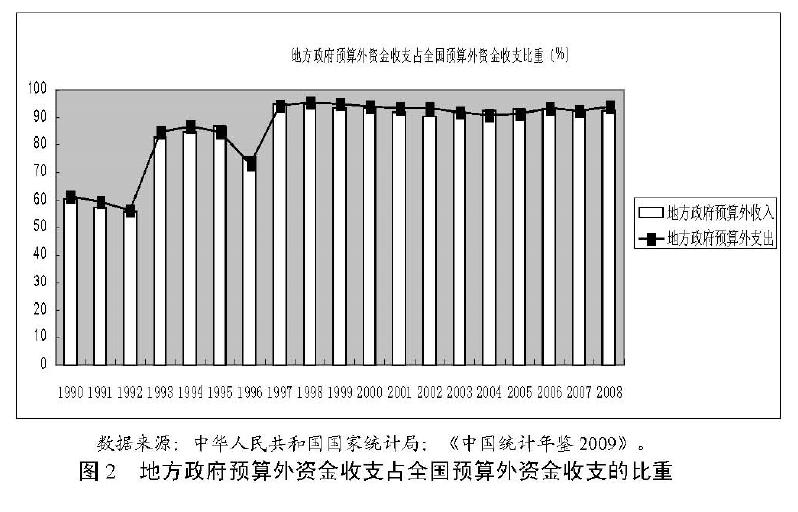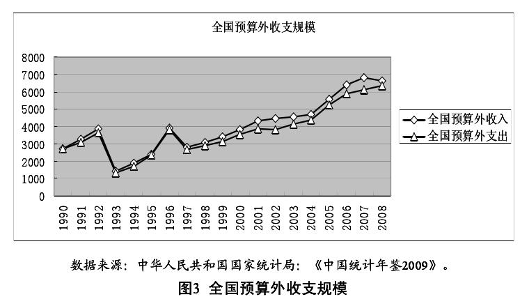 中国在 1994 年分税制改革前实行的是“财政包干制”。地方拥有剩余收入的索取权,这调动了地方政府官员致力于发展地方经济和建设地方税基的积极性。其中突出表现为各地方乡镇企业的蓬勃发展,到 1992 年底,乡村企业的产值占全国工业总产值的 1/4。而在 1994 年实行分税制改革后,地方流向中央的财政收入不仅包括 76%的增值税、100%的消费税,还包括100%关税、证券交易印花税等[23]。中央政府在新收入分享制度的设计上,将收入中贡献大且稳定的部分化为中央所有,这大大提高了中央财政的收入,财政具有明显的集权趋势。如图 1 所示,1994 年中央政府的初始收入占全国财政收入的比例高达 55.7%,远高于 1993 年的 22%。分税制的实行降低了地方政府财政收入的初始分配,地方政府官员致力于地方税基建设的积极性受到不同程度的削弱。再加上收入分权调整后,中央和地方之间的事权并没有得到相应的调整,而地方政府负担着众多事权,这使得地方政府支出与收入存在很大缺口。地方政府官员为缓解财政收支压力,具有通过各种渠道获取预算外收入的激励,甚至增加辖区内的体制外收入。如图 2 所示,地方政府预算外的收入和支出规模占全国预算外收入和支出的规模在 1994 年前后出现显著的变化,由 1994 年前占比约为 60%到 1994 年后高达 90%,且呈现稳定的趋势。全国预算外资金收支规模也不断扩大,如图 3 所示,在 2008年全国预算外收入和支出的规模高达 6617.25 亿元和 6346.36 亿元。