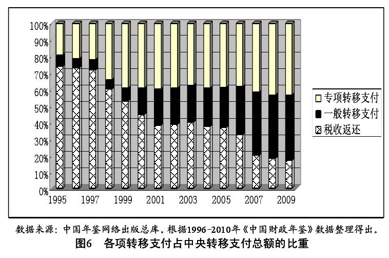 1994 年分税制改革后,中国中央政府加大了对财力的控制力度,大大降低了地方政府的初始收入。由此,中央政府产生了大规模的转移支付。如- 185 -图 5 所示,地方政府的财政收入在 1994 年后,其初始财政收入与上解下拨后的财政收入存在巨大的差距,地方政府约 40%的收入来源于中央政府的转移支付。中央政府如此大规模的转移支付,使得各地区地方政府具有积极实行“跑部进京”[24]的激励。中国转移支付主要包括税收返还、一般性转移支 付以及专项转移支付,其中税收返还是保证地方政府的既得利益,相对于其他类型的转移支付类型,税收返还占转移支付规模比重呈快速下降趋势。如图 6 所示,从 1995 年的 73.7%下降到了 2009 年的 17.1%。但这种对所有地区无差别的基数税收返还不仅没有缩小地区间财政能力的差距,反而在实行分税制以来肯定了这一差距。同时,具有缩小地区财政能力差距效应的一般性转移支付和专项转移支付,从 1995 年以来虽然总体上呈现上升的趋势,但总体规模较小。这使得各地方争取转移支付资金规模大小,依赖于各地区地方政府官员与中央政府讨价还价的能力。由此可知,我国中央对地方收入转移支付制度的设计与运行并不能很好地均衡地区的财政能力,这使得地方官员具有很强的激励同中央政府进行周旋。