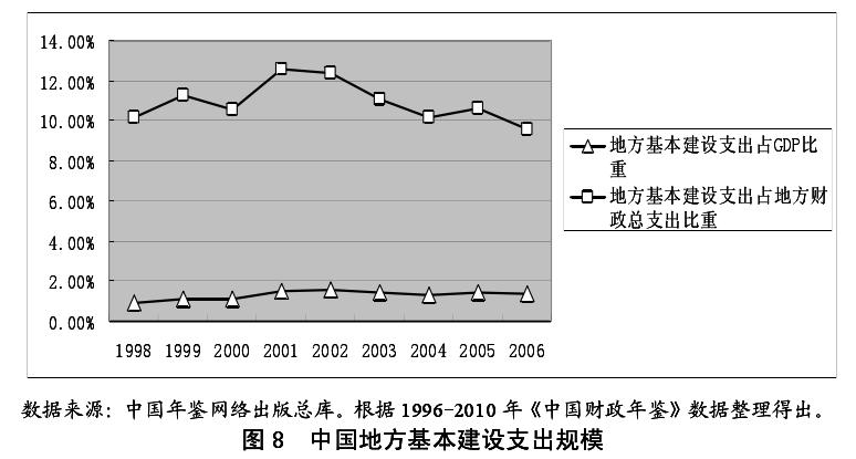 地方官员对辖区内能源、交通、通讯等基础设施的投资规模大小,直接影响着地区投资环境的建设及其经济增长。随着中国财政分权体制的形成,中央把越来越多的基础设施投资决策权下放到地方。魏新亚[26]研究发现,中央项目的比例从 1991 年的 50%以上下降到 1999 年的 32.5%。而地方财政支出结构中基本建设支出,占地方财政总支出的比重也高达 10%左右。如图 8所示,从 2000 年到 2006 年,地方基本建设支出占地方财政总支出的比重最 高为 2001 年的 12.5%,最低为 2006 年的 9.6%。其中,地方在交通运输方面的支出占地方财政总支出的规模为 2%左右。而 2009 年为应对金融危机的冲击,地方加强对基础设施建设的投入,仅交通运输的支出增长就为地方财政总支出的 5.8%,其投资规模从 2007 年的 1133.13 亿元增长到 2009 年的3578.37 亿元。同时,地方基本建设规模支出占全国的 GDP 比重波动很小,稳定在 1%左右。地方官员对交通等经济性公共物品的投资热情有增无减,与经济性公共物品的数量和质量直接影响地区经济增长息息相关。由于交通等基本建设的投资有利于创造良好的投资环境,以利于各地区地方官员在 “招商引资”的激烈竞争中胜出;同时还可为辖区内的经济发展吸收更多的资金,吸引更多优秀企业进入,促进经济的增长,从而提高地方官员任期内的政绩,向中央政府显示其执政能力强,进而在地方官员的晋升竞争中胜出,顺利获得晋升。