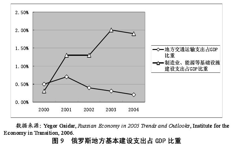 与中国相同,进行基础设施等经济性公共物品的建设,也是俄罗斯各联邦主体地方官员预算支出的重要选择,但支出重点与政策导向和激励方向密切相关。如图 9 所示,2000 年以后,各联邦主体的预算支出中,制造业、能源等基础设施的建设支出规模占 GDP 的比重呈上升的趋势,从 2000 年的0.3%上升到 2003 年的 2%。但各地方对交通运输业的预算支出占 GDP 比重规模较小且呈下降的趋势,从 2001 年的 0.7%下降到 2004 年的 0.2%。这与经济恢复初期的启动领域和重点密切相关。相较于交通基础设施,制造业和能源基础设施的更新和改造更为迫切。同时,苏联时期建造的较为齐全的交通基础设施仍可以勉强使用,这使得各地方在制造业、能源基础设施投资领域和交通运输基础设施投资领域的预算支出,表现出上述差异。但随着经济的恢复,交通基础设施对经济的制约逐步显现。于是,2008 年 11 月 22 日,俄总理普京签署命令,批准了《俄联邦至 2030 年交通发展战略》[27],以改善较为陈旧的交通基础设施。联邦各主体投资总额占投资总额的 14%,其中公路投资所占比重高达 26%。[28]