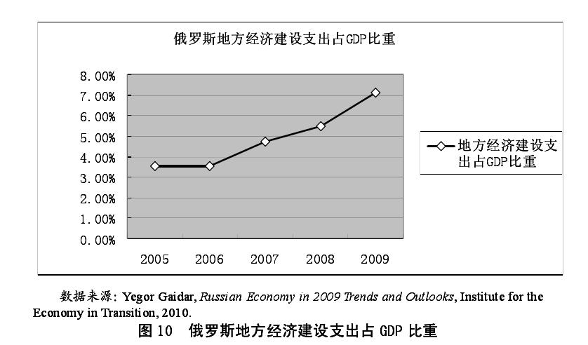 同时,如图 10 所示,自 2005 年以来,俄罗斯各联邦主体支出预算中为支持经济发展的基础设施建设投资规模占 GDP 的比重也不断上升,到 2009年已高达 7.1%。从 2000 年以来,俄罗斯地方官员致力于辖区内经济性公共物品的提供,与普京执政以来建立起垂直政治体系,加大对地方官员的监督和控制息息相关。普京通过设置联邦区和任命驻联邦区全权代表对地方当局进行控制,将地方领导人的影响局限于处理地方事务,且查处地方领导人、地方议会违宪行为的权力归联邦中央所有。这进一步加强了联邦中央对地方官员的控制与监督,大大增强了俄罗斯地方官员凭借其政治权力向资源、能源等垄断行业获取权力租金的风险,使得地方官员倾向于贯彻执行联邦中央 的经济政策,改善辖区内经济发展环境,促进经济增长,以期获得连任或在更高级别的任命中争取机会。