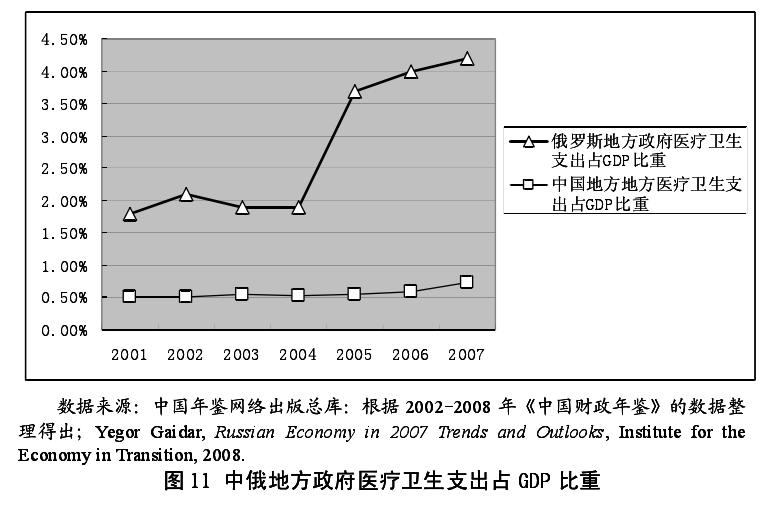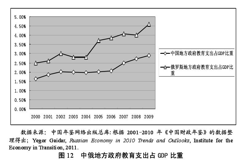 地方官员对教育、环境保护设施、医疗卫生等非经济性公共物品的提供,对辖区内居民的生活福利,以及经济的可持续发展具有重要影响。但中俄两国转型现阶段分权治理所表现出的中央政府对地方政府控制强的形势,使得地方官员在很大程度上只向中央政府负责,而忽视其辖区内居民的生活福利以及经济可持续发展等问题。其中,俄罗斯转型以来所确立的政治民主化,导致其地方官员在一定程度上比中国地方官员更关注其辖区内居民的福利以及经济发展的可持续性。如图 11 所示,中俄两国地方政府医疗卫生支出规模存在显著的差异。中国地方政府医疗卫生支出占 GDP 的比重仅为 0.6%左右,且增长缓慢,其支出规模从 2001 年的 0.508%到 2007 年的 0.736%,七年时间仅增长了 0.228%,这一增长速度远远落后于中国各地区经济的增长水平。而俄罗斯地方政府的医疗卫生支出规模,要远远高于中国地方政府支出的规模,且支出规模从 2004 年开始出现迅速增长的局面,到 2007 年支出规模占 GDP 的比重高达 4.2%。同时,教育作为积累人力资本的重要渠道,对经济的可持续发展具有基础性的作用。而中俄两国地方政府对教育的支出规模也存在很大的差异。如图 12 所示,中国地方政府的教育支出占 GDP 的比重稳定在 2%左右,从 2006 年开始出现较大幅度的增长,在 2009 年达到2.9%。而俄罗斯地方政府对教育的预算支出规模占 GDP 的比重高于我国 2%的水平,且呈不断上升的趋势,其支出规模占 GDP 的比重从 2000 年的 2.5%上升到 2009 年的 4.6%。