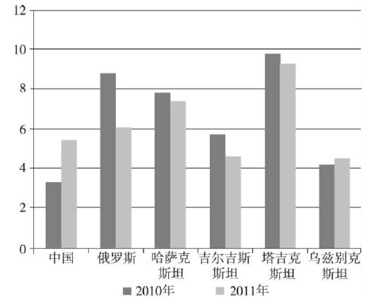 图1 2010~2011年上合组织成员国通货膨胀率变化(%)