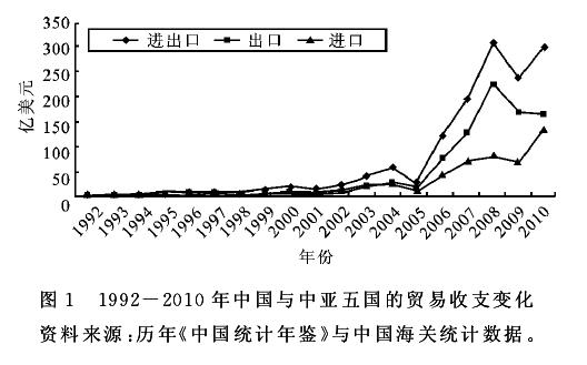 1992年以来,中国与中亚五国的贸易总量总体上保持着增长趋势(如图1)。中国与中亚五国的进出口贸易 总额从1992年的4.65亿美元 增 长 到2010年的300.93亿美元,总量增长了60多倍。其中,中国对中亚五国的出口额由1992年的2.91亿美元增加到2010年的165.31亿美元,进口额从1992年的1.74亿美元增长为 2010年的135.62亿美元。