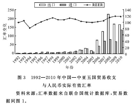 改革开放以后,中国加强人民币汇率市场化改革。改革开放之初,人民汇率实行双轨制。1994年,人民币汇率体制又进行了重大改革,实施有管理的浮动汇率制。2005年7月21日,中国实行以市场供求为基础、参考一篮子货币进行调节、有管理的浮动汇率制度。从名义汇率看,1994年为8.618 7美元/人民币元,2010年升值到6.770 4美元/人民币元①。而从IMF公布的人民币实际有效汇率看,1994—1998年和2005-2010年人民币呈现升值态势(见图3)。一般而言,名义汇率与实际汇率应具有很大的相关性,但也可能由于某些原因造成两者背离均衡汇率。1992—2010年,随着人民币实际有效汇率的变化,中国对中亚五国的进出口贸易也发生了变化(如图3)。1994—1997年、2005—2010年,实际有效汇率指数上升,人民币升值,中国从中亚五国进口增加迅速;2001—2004年,实际有效汇率指数下降,人民币贬值,出口显著增加,但在2005—2010年人民币升值时,中国对中亚五国的出口也快速增长,出口从17.22亿美元增加到165.31亿美元(期间2008年达到阶段峰值225.96亿美元)。