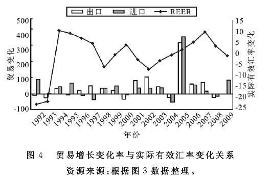 从进出口贸易的变动率和实际有效汇率的变动率角度考察(见图4),可以发现:当实际有效汇率增长率为正,即人民币升值时,中国对中亚五国进口的增长速度明显加快;当实际有效汇率增长率为负值,即人民币贬值时,中国对中亚五国的进口速度放缓,并对出口的影响并明显,但在每次人民币汇率改革前后,进口变化明显。