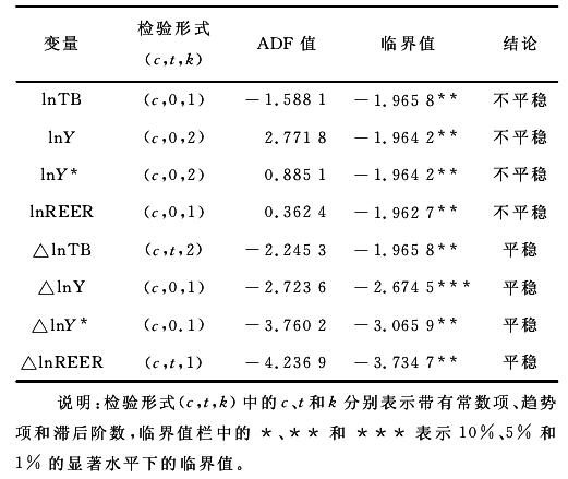 由于只有相同单整阶数的序列才有可能存在协整关系,为此对各个变量的时间序列进行平稳性检验,在这里,我们运用ADF检验法进行序列的单位根检验。检验结果表明(见表1),水平项lnTB、lnY、lnY*与lnREER的ADF值,均大于不同检验水平的三个最小临界值,存在单位根,为非平稳序列。将变量一阶差分后进行平稳性检验,检验结果表明(见表 1),一阶差分后lnTB、lnY、lnY*与lnREER均为平稳序列。因此,单位根检验表明,lnTB、lnY、lnY*与lnREER均为I(1)过程。