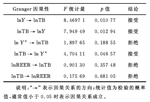 协整检验只能表明人民币实际汇率与中国对中亚五国贸易收支存在长期的均衡关系但并不能确定是否存在统计意义上的因果关系。前面分析表明,lnTB、lnY、lnY*与lnREER均为I(1)过程,此, 可以进行Granger因果检验。根据检验结果可以看出(见表2),人民币实际有效汇率与中国对中亚五国的贸易收支不存在Granger因果关系,即短期内汇率的变动不会引起双边贸易收支的变动,双边贸易收支的变动也不会引起汇率的变动;中国对中亚五国的贸易收支是 中国和中亚 五 国 实 际 收 入 的Granger因,说明改善中国对中亚五国贸易收支可以极大地拉动中国与中亚五国的经济增长;中国实际收入增长是中国对中亚五国的贸易收支变动的Granger因,说明中国经济发展可以为中亚五国提 供更多优质产品,促使出口增长。