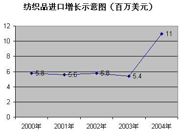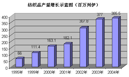 由于摩自独立以后出现经济危机状态,加上摩本国纺织原料产量不足,成衣生产主要以来料加工为主,根据世行统计显示,摩成衣生产78%为境外来料加工,自2000年始至今,产量出现恢复性增长,虽然还没有恢复到90年代水平,但大部分成衣制造企业产值和利润有一定增长,债务问题有所缓解,库存积压商品减少,支付能力得到改善。从下表中统计数据可以看出,2004年成衣总产值比2000年增长了2倍以上。约3000万美元(现行汇率12.5列伊等于1美元)。