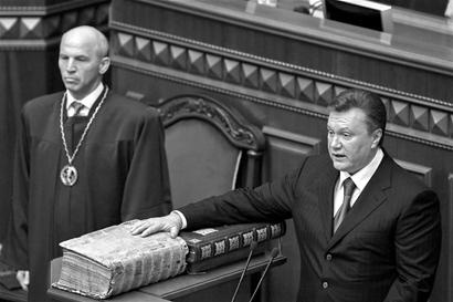 当地时间上午10时10分,新总统就职典礼正式开始。亚努科维奇把右手放在一本《乌克兰宪法》和一本《圣经》古书上宣誓。他说:“我将竭尽全力捍卫乌克兰的主权和独立,为国家的前途和乌克兰人民的福祉而奋斗。”