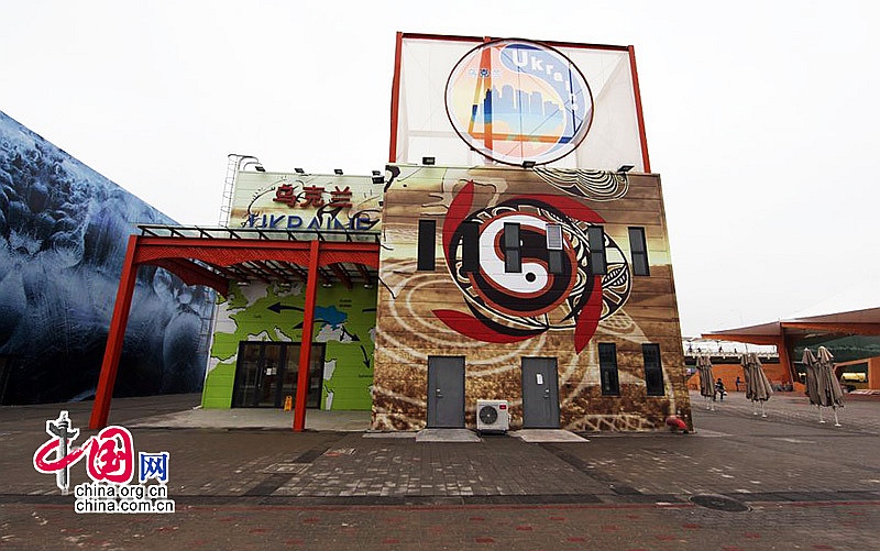 乌克兰馆位于世博园C片区中部,主题是“从古老迈向现代”。在乌克兰馆的外墙可以看到类似中国八卦图案的装饰,实际上这些图案来源于三褶系部落文明的符号,由红、黑、白三色装饰组成。以蛇装点的流动漩涡,寓意时间流逝和季节变化;狗象征着驱赶所有邪恶势力;太阳则象征着源源不断的动力。